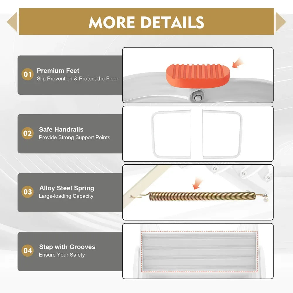 Are you looking for a high-quality wall-mounted folding ladder? This product will win your favor! High-quality materials, high hardness, and sturdy structure can support a weight of 881.85 lbs. The pedal texture can increase stability during use. The foldable design not only provides convenience for you but also saves space. This is your ideal choice!