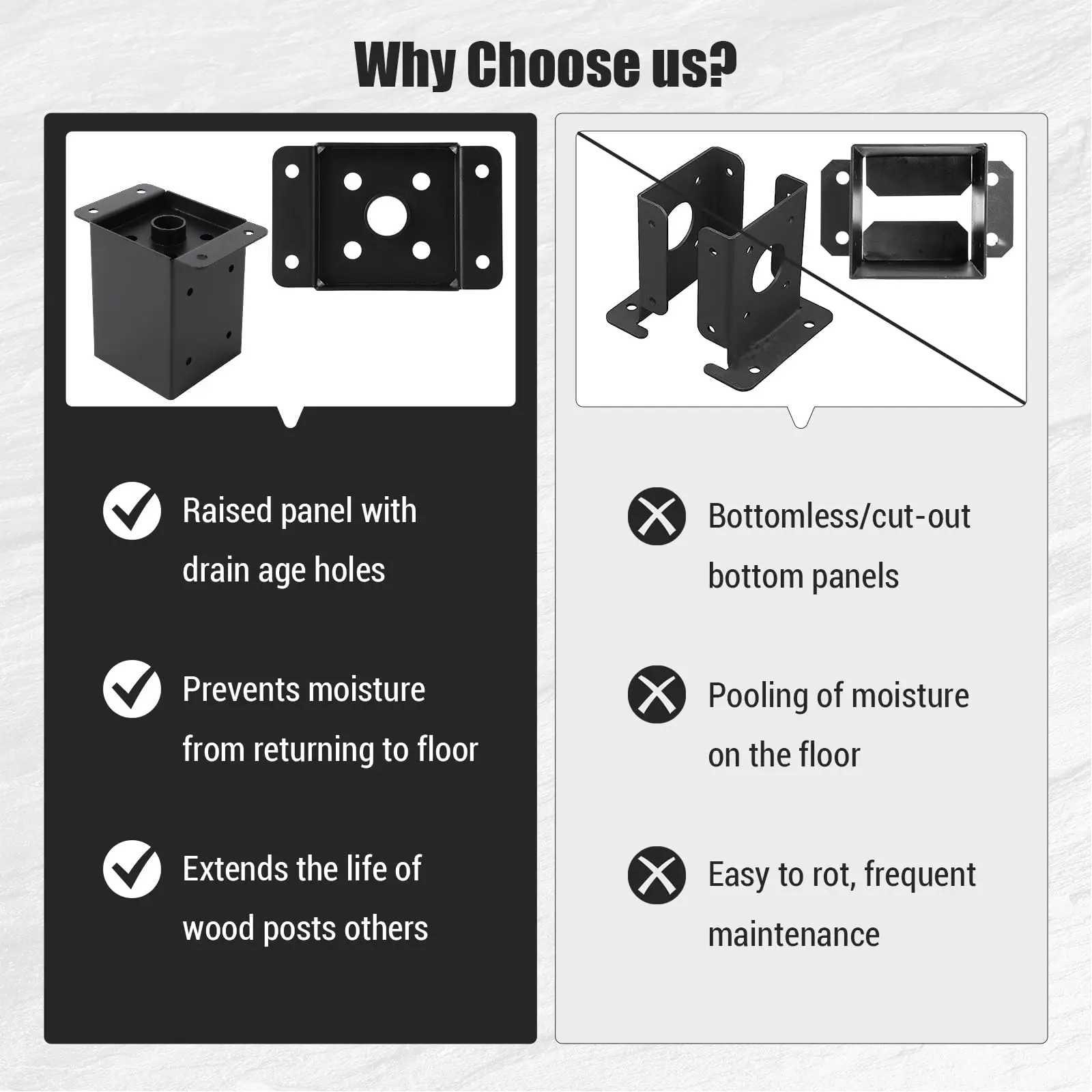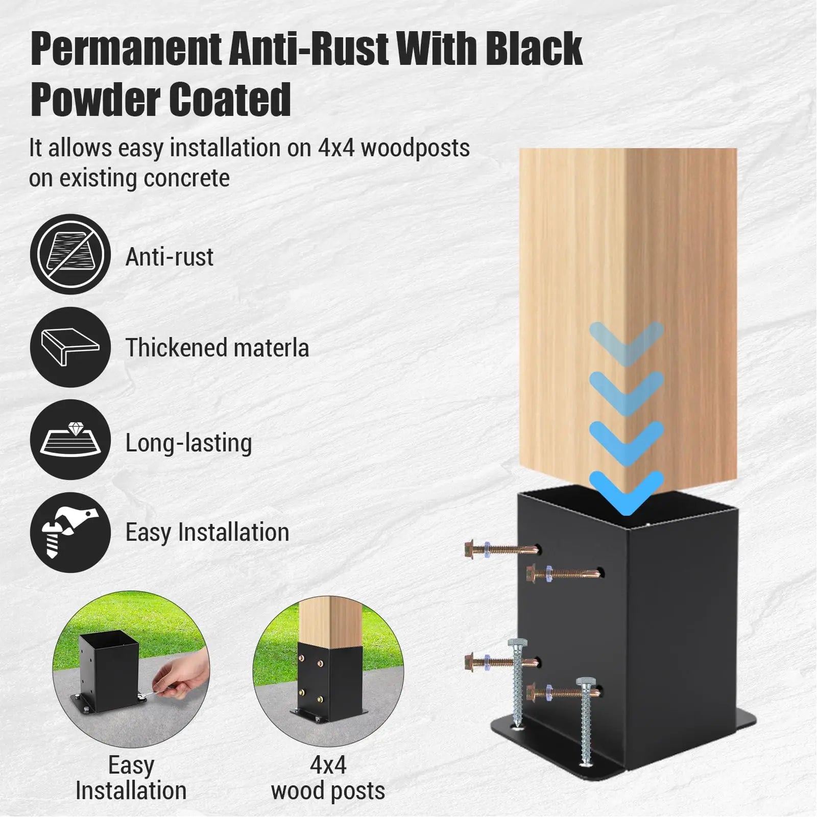 Elevated Interior Base:Unique raised design keeps wood posts 0.3" above ground. Drainage holes allow trapped water to escape, doubling your structure’s lifespan.Built to withstand rain, snow, and harsh outdoor conditions.