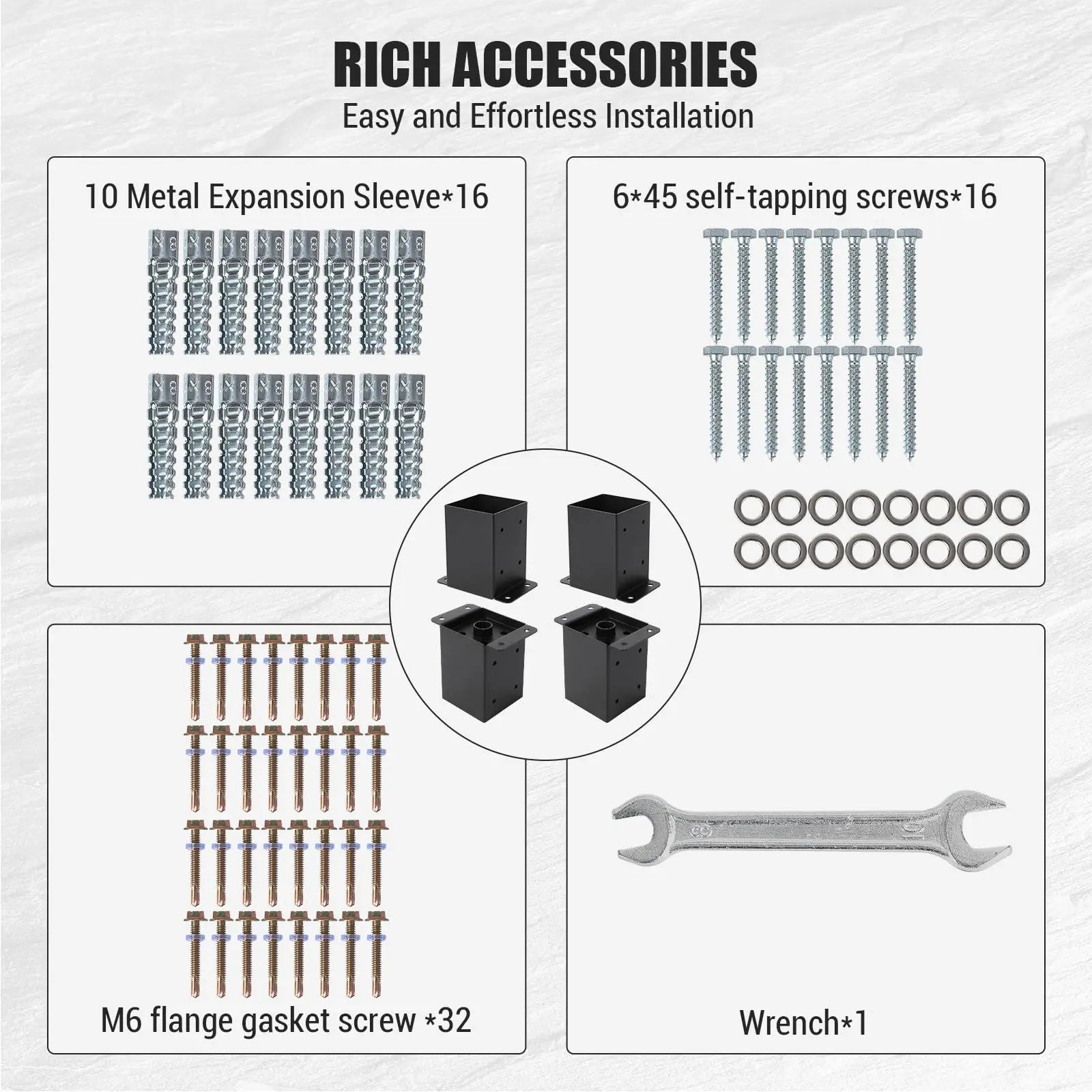 Pre-Drilled Holes for Fast Installation:Precision-engineered brackets with aligned holes ensure quick, wobble-free assembly. Securely attach to concrete slabs or wooden frames.