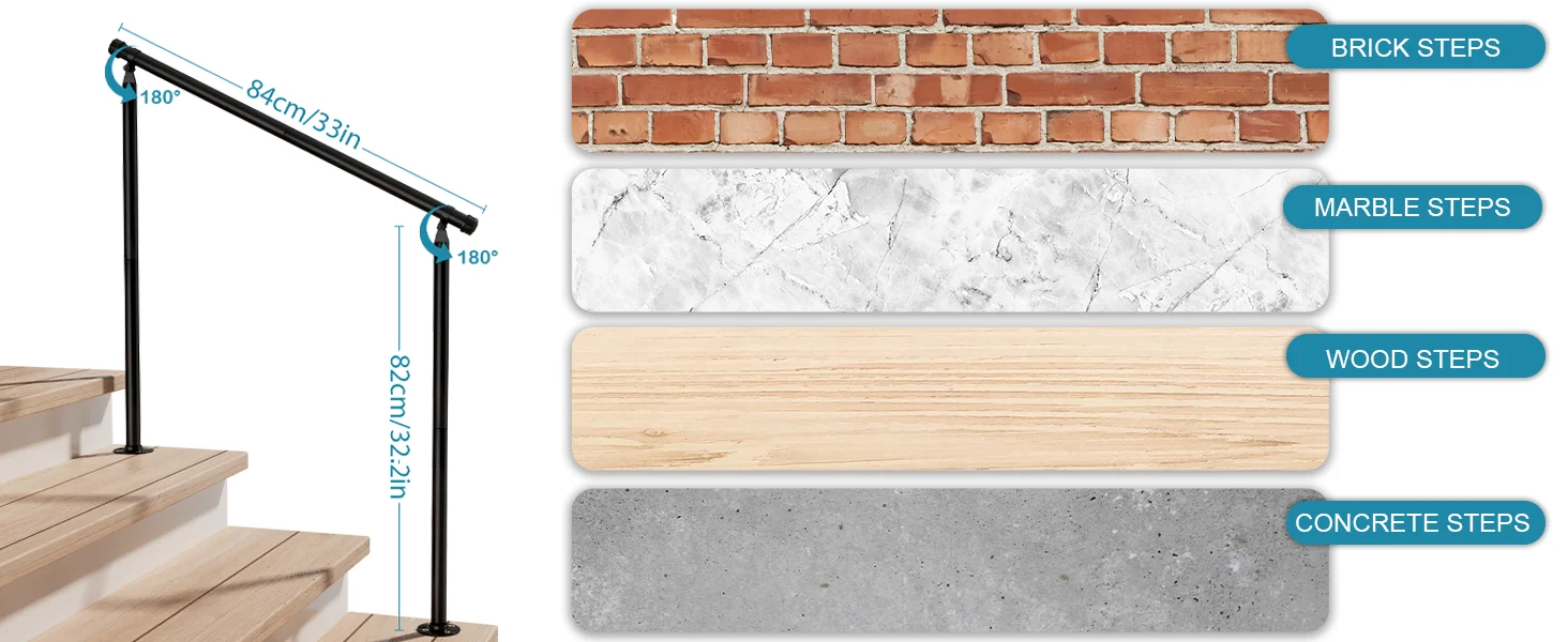 The stair railing with a flexible screw connection, adjusts 0-180° for a custom fit on stairs of any height, meeting your diverse needs effortlessly.