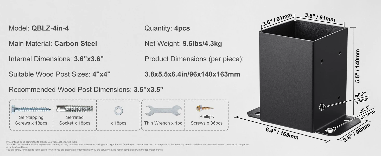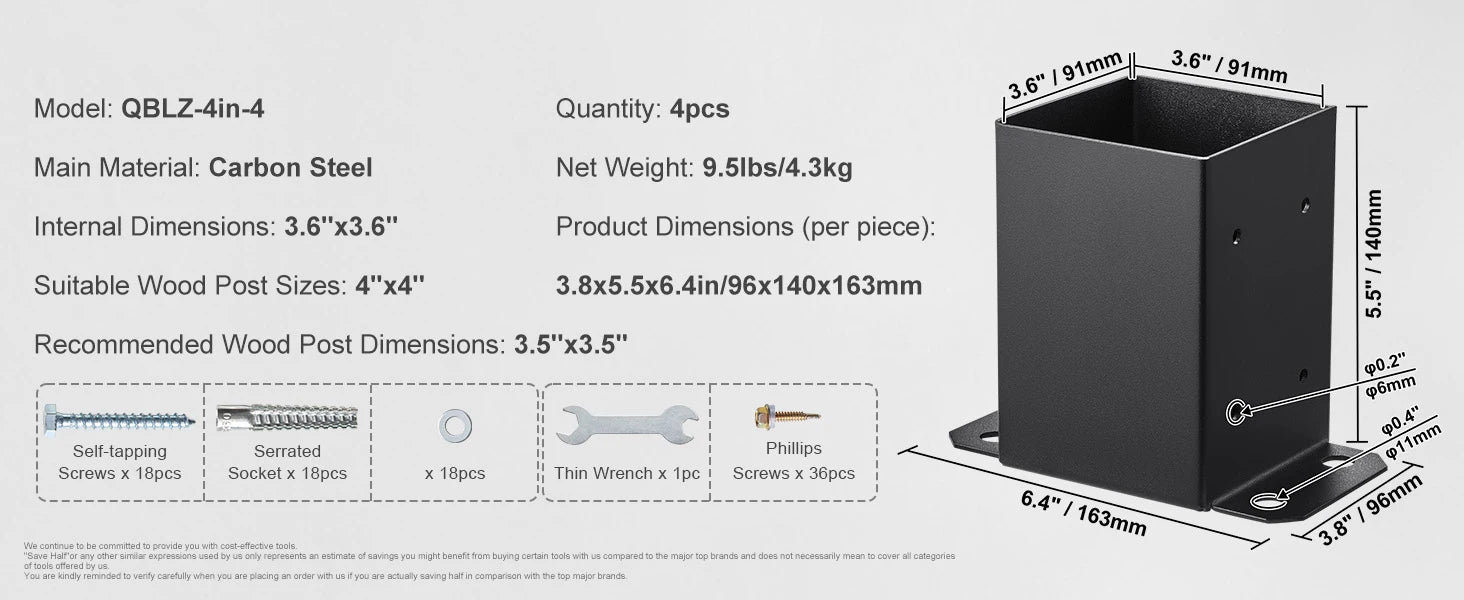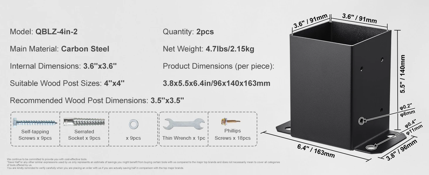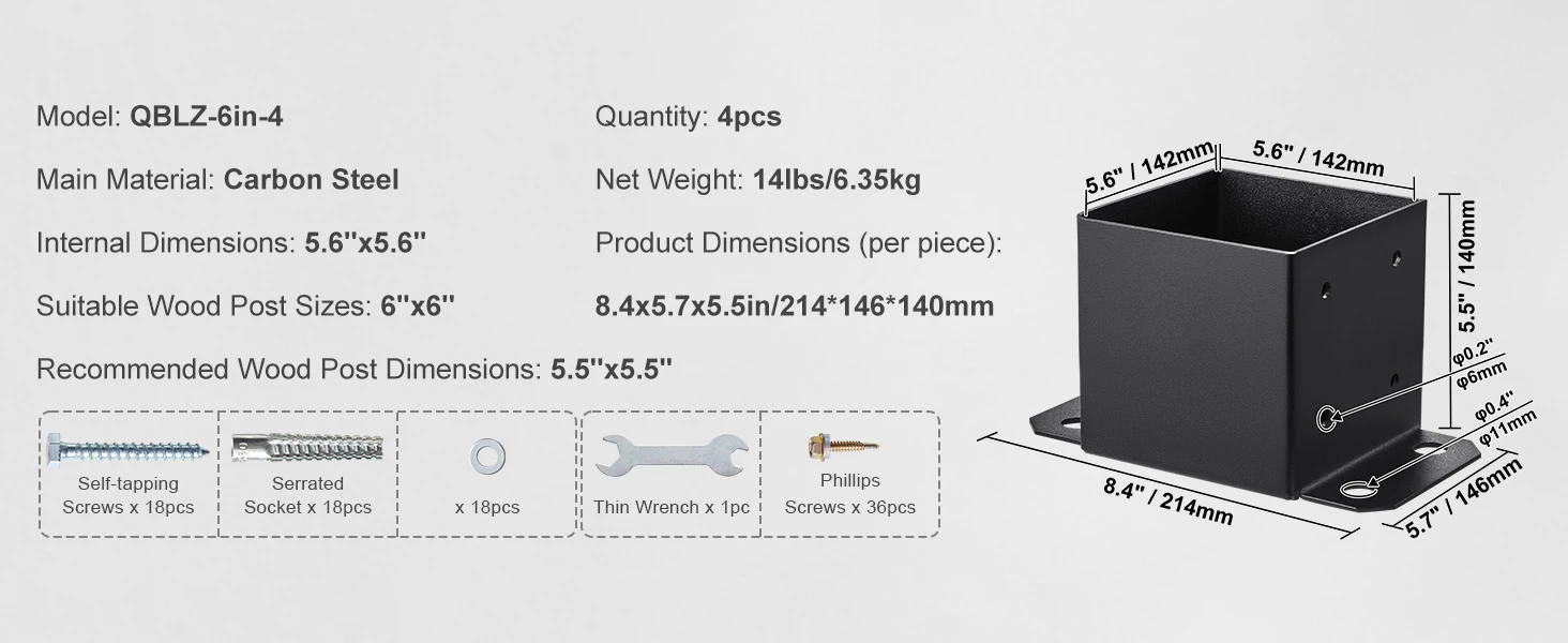 Suitable Wood Post Sizes: 4"x4"/6"x6"