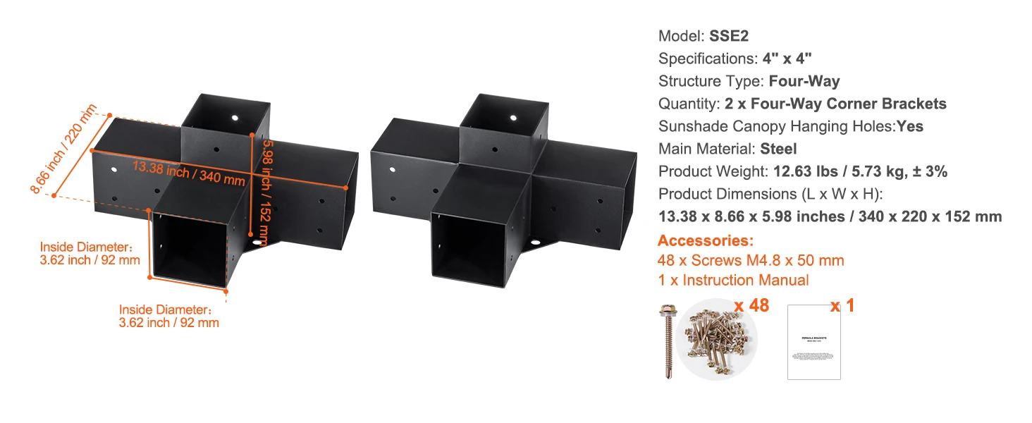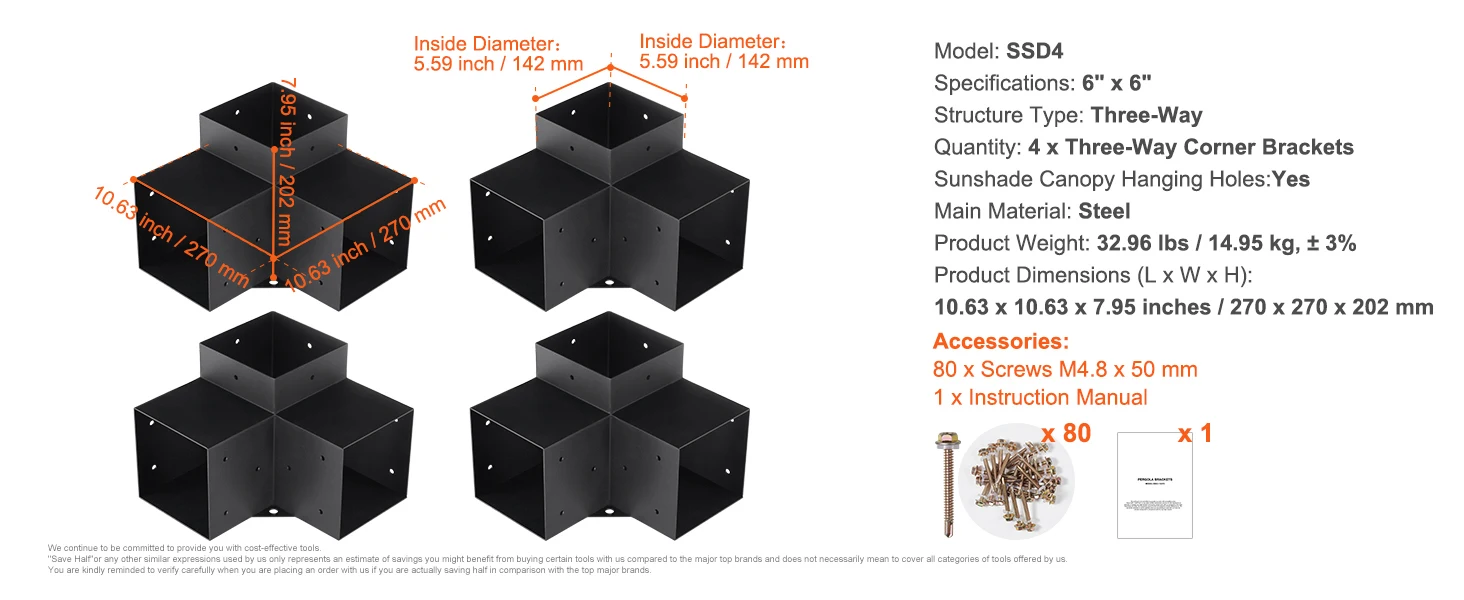6" x 6" Three-Way Pergola Brackets: This durable and strong pergola bracket kit that covers wooden beams, preventing them from rotting due to rainwater and harsh sunlight. It is designed for the mainstream 6" x 6" specifications and can accommodate actual dimensions of 5.6 x 5.6 inches (142 x 142 mm) for both soft and hardwood.