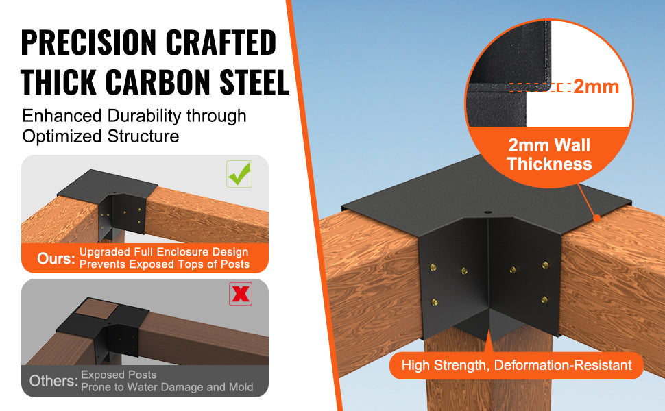 Enhanced Durability: Constructed from 2mm Carbon Steel Plates with Black Powder Coating for Corrosion Resistance. Reinforced 90° Boot Structure Prevents Breakage and Deformation, Ensuring Stability. Full Coverage Design Shields Posts from Rainwater Erosion. Drainage Holes in the Base Prolong Lifespan.
