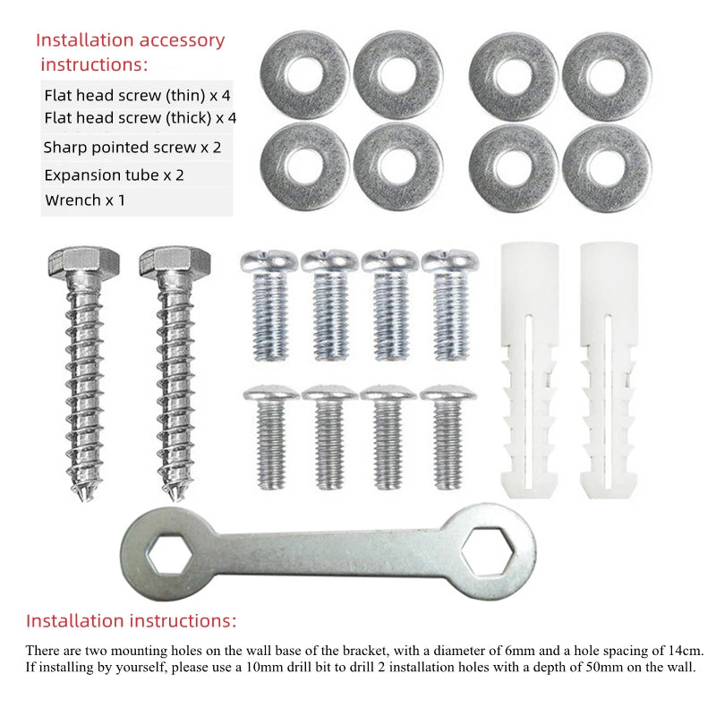 There are two mounting holes on the wall base of the bracket, with a diameter of 6mm and a hole spacing of 14cm. If installing by yourself, please use a 10mm drill bit to drill 2 installation holes with a depth of 50mm on the wall.